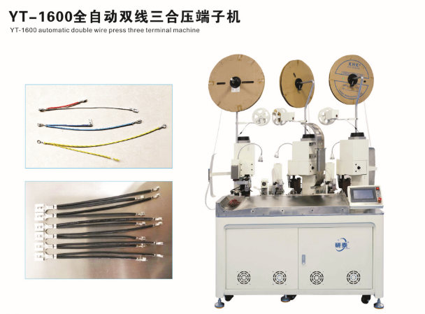 全自動雙頭穿護套端子機、全自動雙頭穿熱縮管端子機、全自動銅帶壓接端子機、全自動雙頭端子機、全自動排線端子機、全自動沾錫打端機、全自動打端插殼機、新能源全自動雙頭穿熱縮管散粒端子機、新能源全自動雙壓單穿激光打號碼管端子機、新能源大平方穿號碼管端子機。